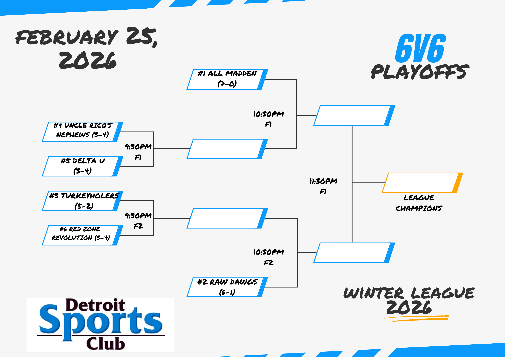 Join Michigan's largest adult flag football league with offerings in Warren (4v4 on Sundays), Farmington (6v6 on Thursdays), and Royal Oak (8v8 on Fridays)